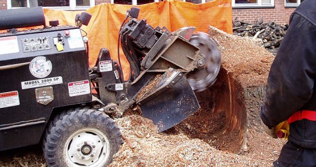 Etter endt trefelling kutter vi også stubben så nær bakken som mulig.